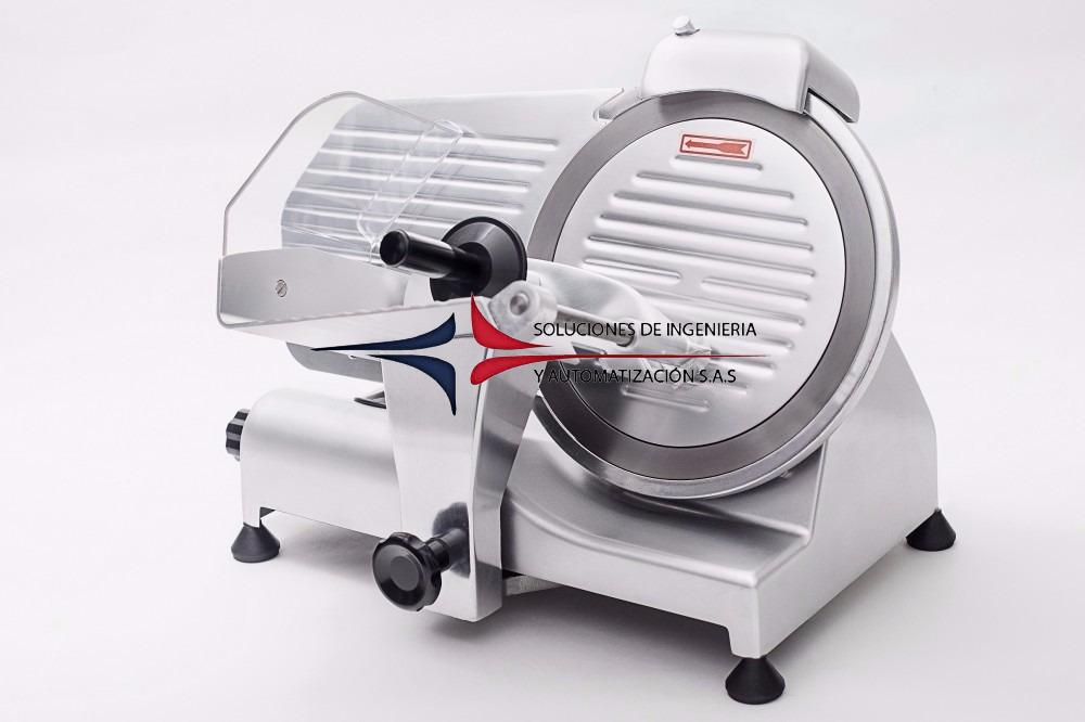 Cortadora de productos para charcutería semiautomática, fabricada con aleación de aluminio y magnesio con capacidad de corte hasta 12 mm, superficies pulidas y anodizadas, disco en acero inoxidable y control de motor mediante dispositivos semiconductores. Protector de seguridad sobre el disco, sistema de afilado integrado e interruptor de seguridad Ideal para corte de jamón, quesos y carnes frías en salsamentarías, carnicerías, restaurantes, hoteles y tiendas tipo cigarrerías
