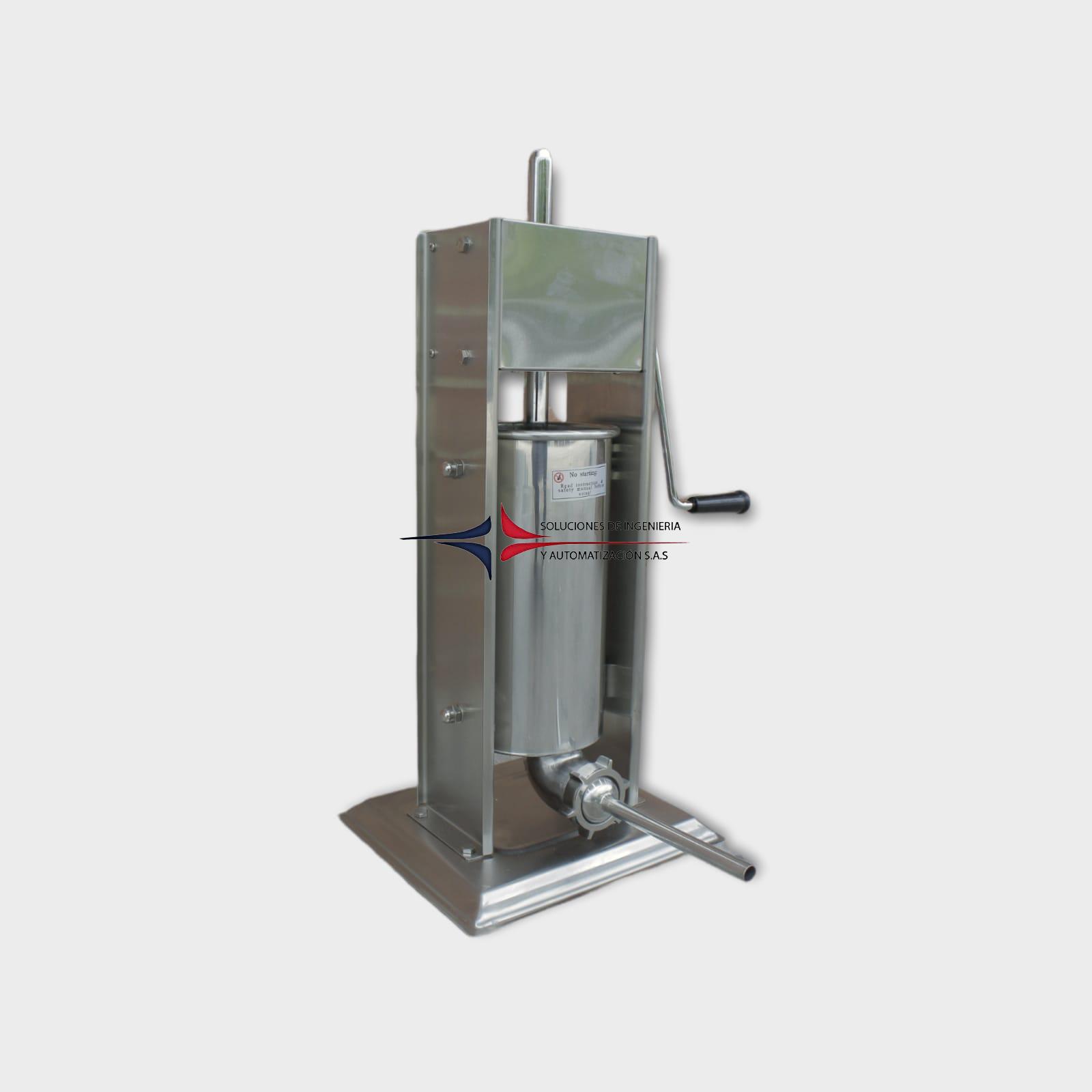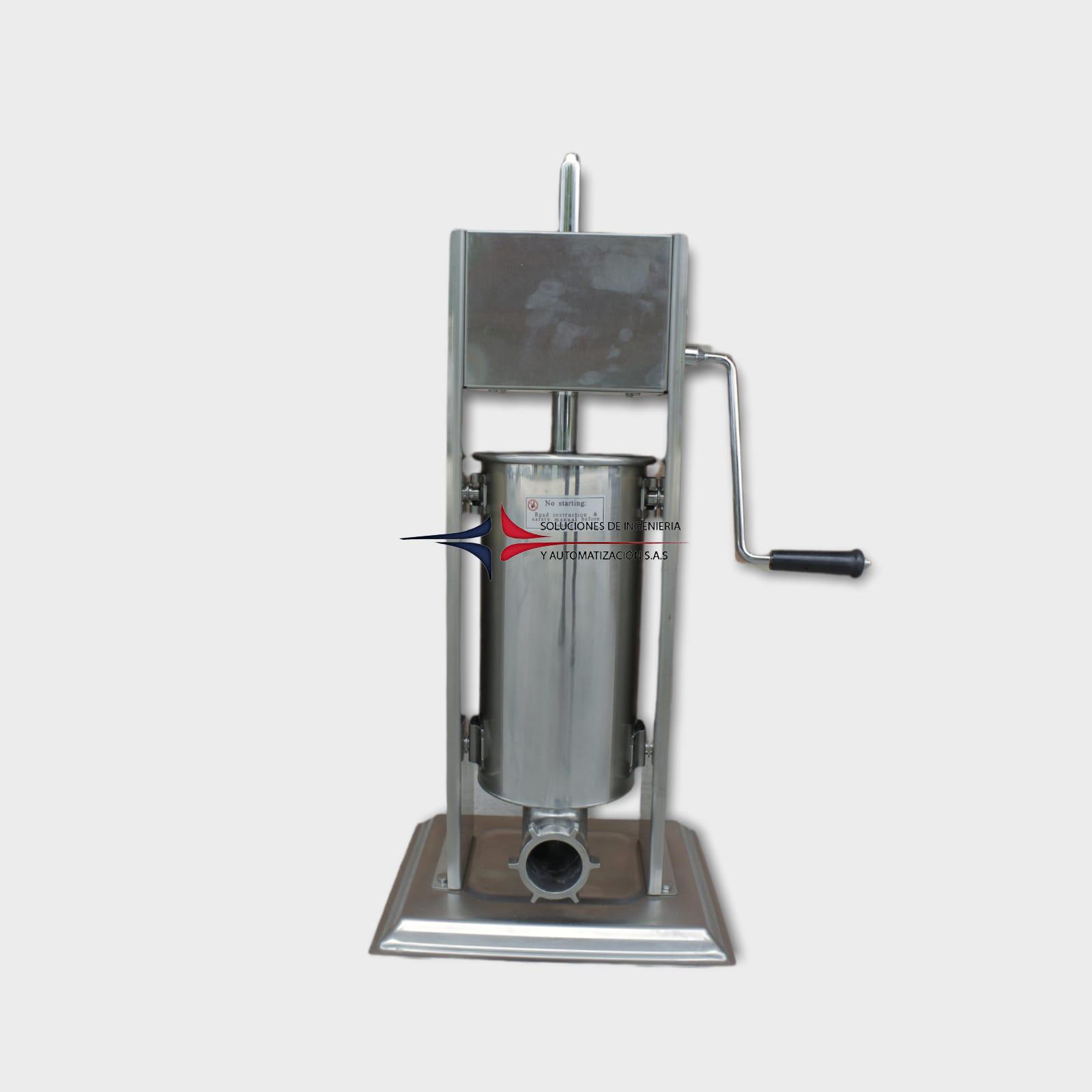 Máquina para relleno manual de embutidos construida en acero inoxidable, diseño vertical, larga vida útil, con nuevo sistema de engranajes, que permite al usuario soltar el émbolo para un llenado rápido y fácil. Es ideal para fabricación de chorizos, con tubos formadores en acero inoxidable de 1.5, 2.5, 3.5 y 4 mm de diámetro. Fácil de limpiar y velocidad de dos niveles para empujar con fuerza y levantar rápidamente