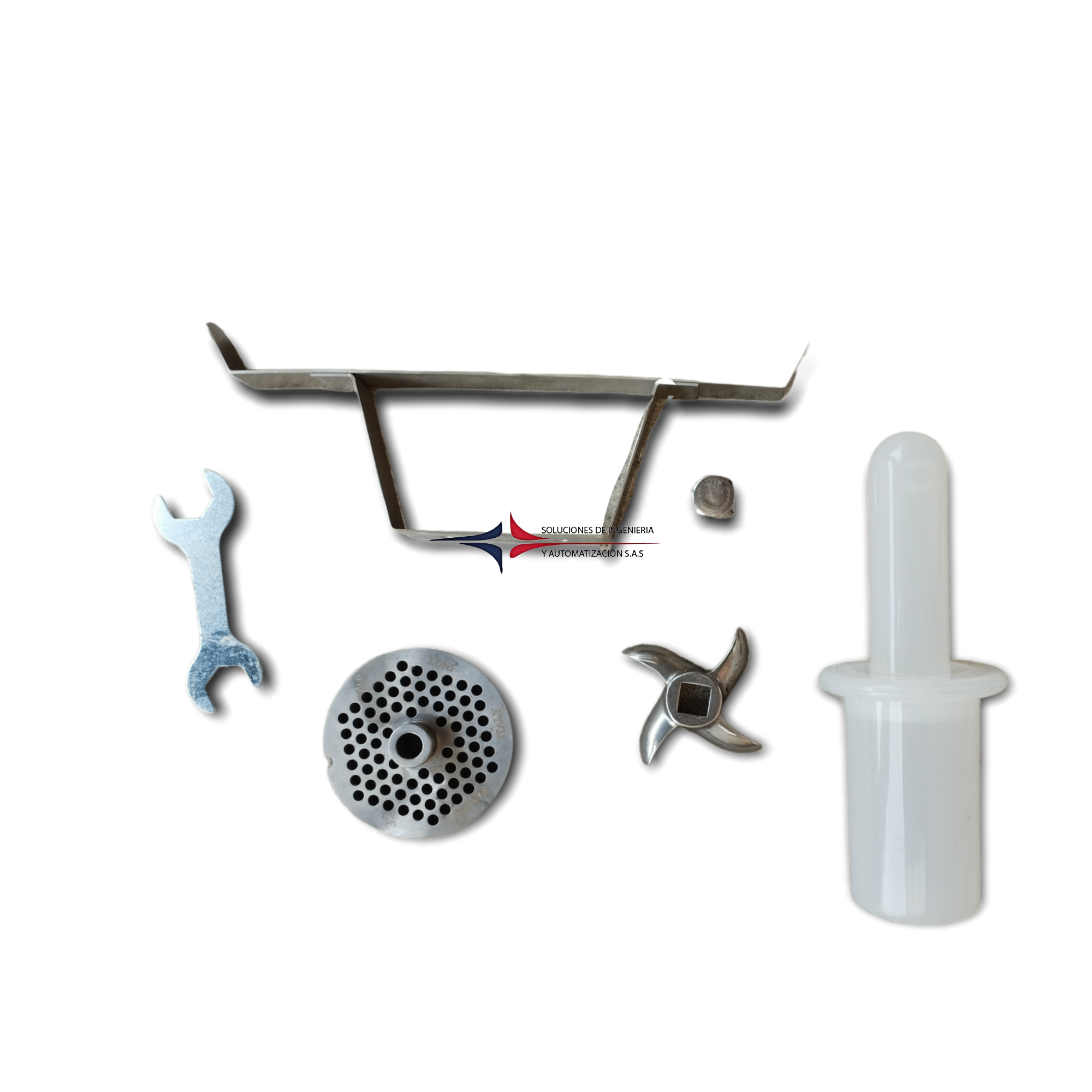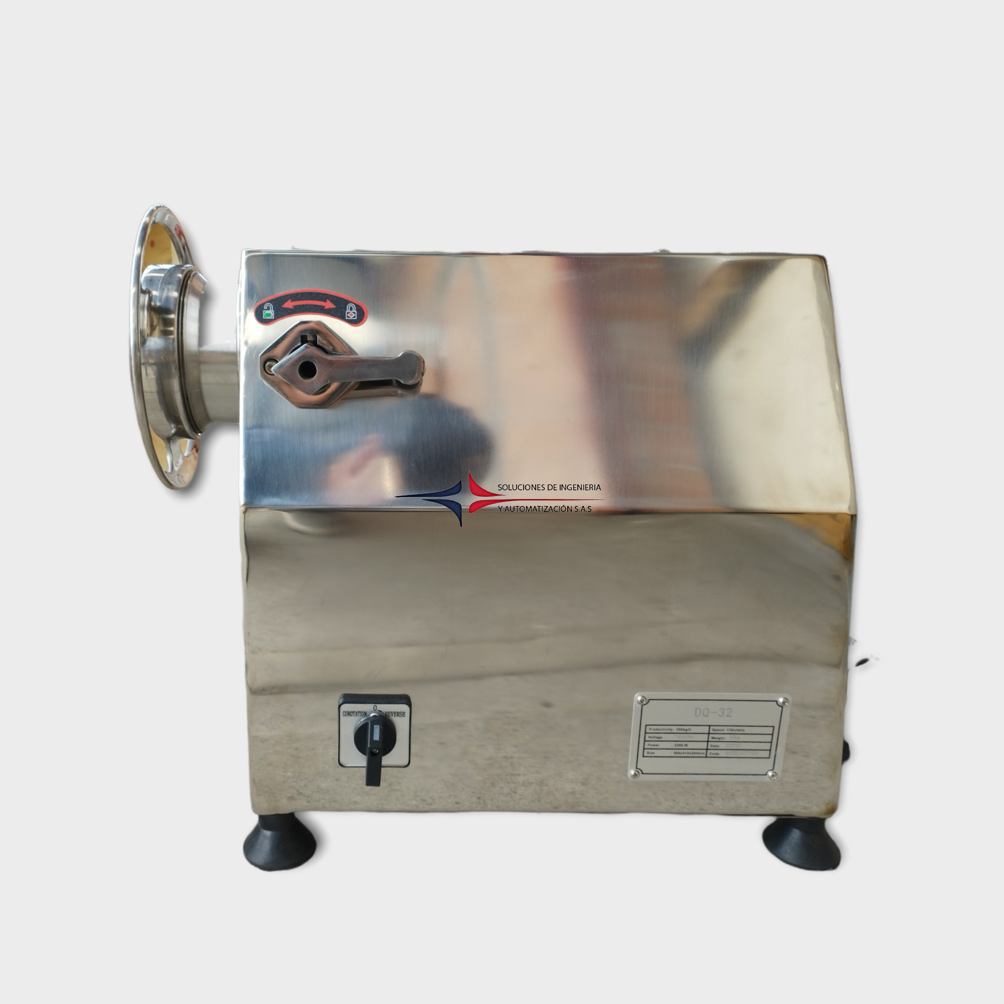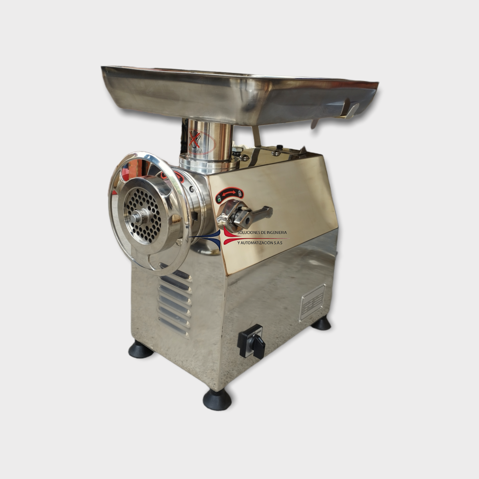 Molino de carne Semi-Industrial fabricado en acero inoxidable y con interruptor reversible en caso de atasco. Con un motor protegido internamente contra sobrecargas y un sistema de trasmisión por piñones helicoidales en bronce. Dispone de un repuesto de disco, un repuesto de cuchilla, un embutidor de plástico de alta resistencia, dos bandejas y un mecanismo de bloqueo del tubo moledor de liberación rápida para doble seguridad. Ideal para trabajos en hoteles, Restaurantes, Plantas procesadoras de Alimentos, Famas de Carne y Restaurantes